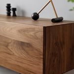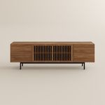 Modern Wood TV Stand, Minimalist Slatted Media Console with Tall-Cast Metal Legs, Walnut Veneer