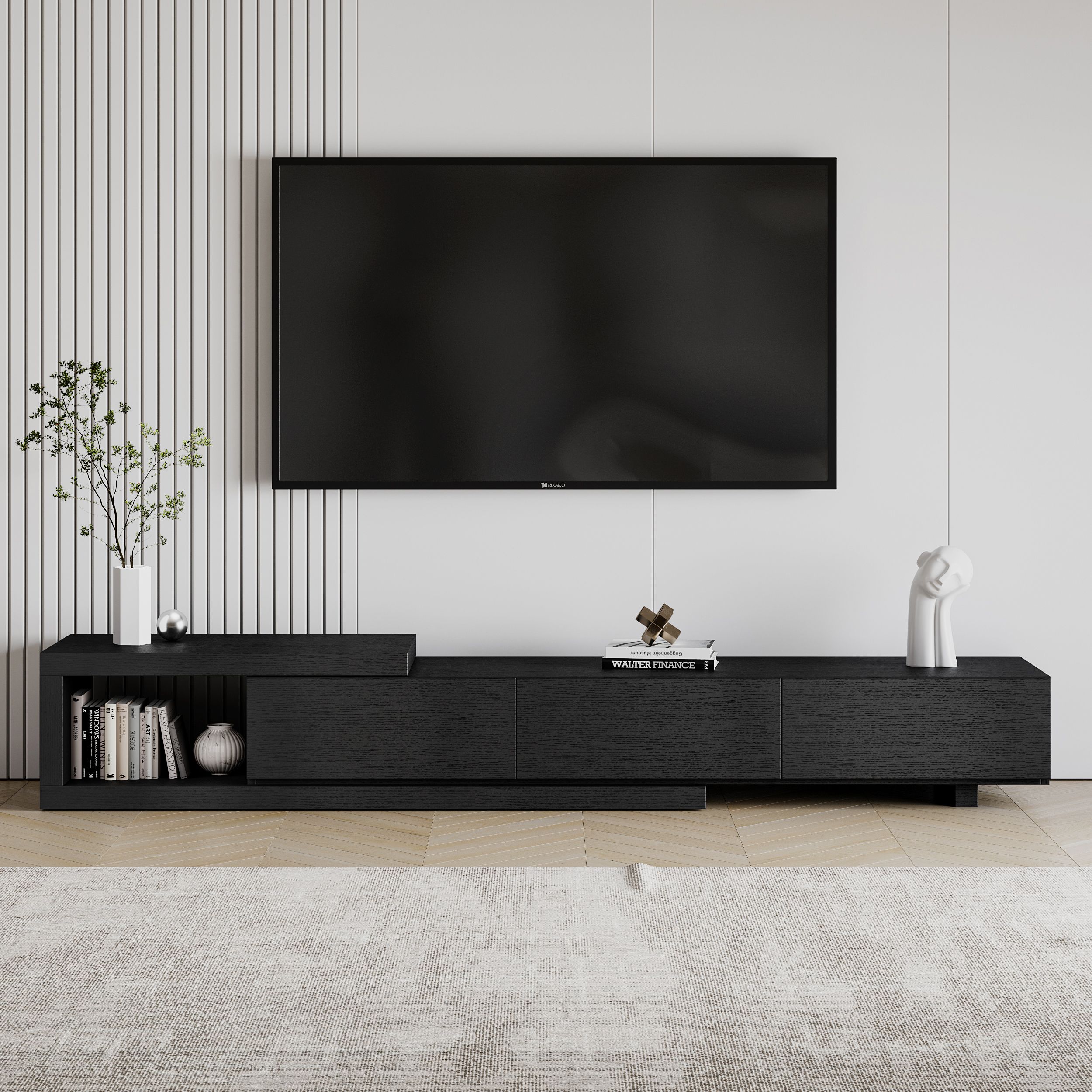 Modern Retractable Wood TV Stand with 3 Drawers, Open Storage, Oak and Black, 70.86“