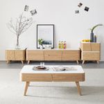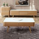 Mid Century Modern Rectangular Coffee Table, Tempered Glass Tabletop, 2 Solid Wood Drawers, MDF, For Livingroom, 45.66’’, Light Wood